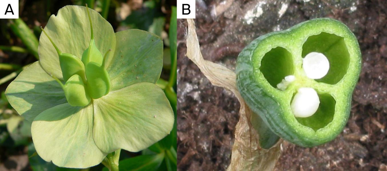 Fig 34: A. Flor de Helleborus (Ranunculaceae) orientalis tras la fecundación. B. Corte transversal del ovario de Narcissus (Amaryllidaceae).