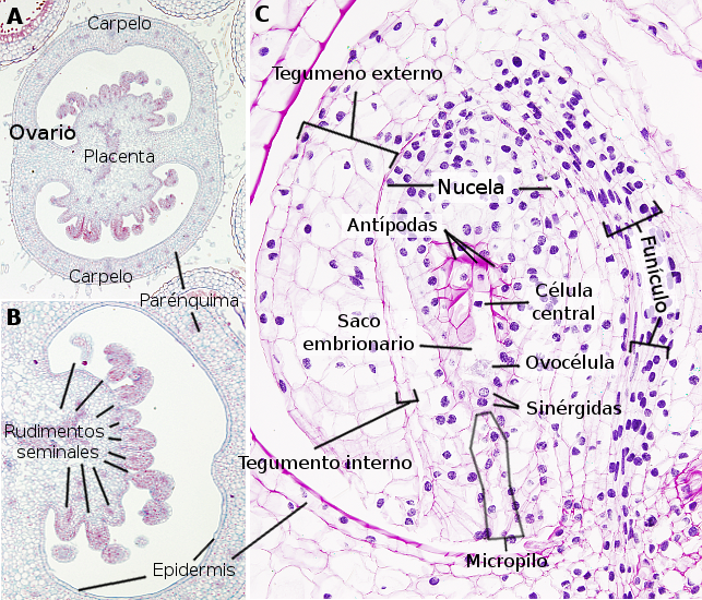 Fig 40: A. y B. Corte transversal de ovario de Digitalis purpurea (Scrophulariaceae). C. Corte longitudinal de Iris sp. (Iridaceae). Megías-Pacheco et al. (2017).