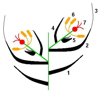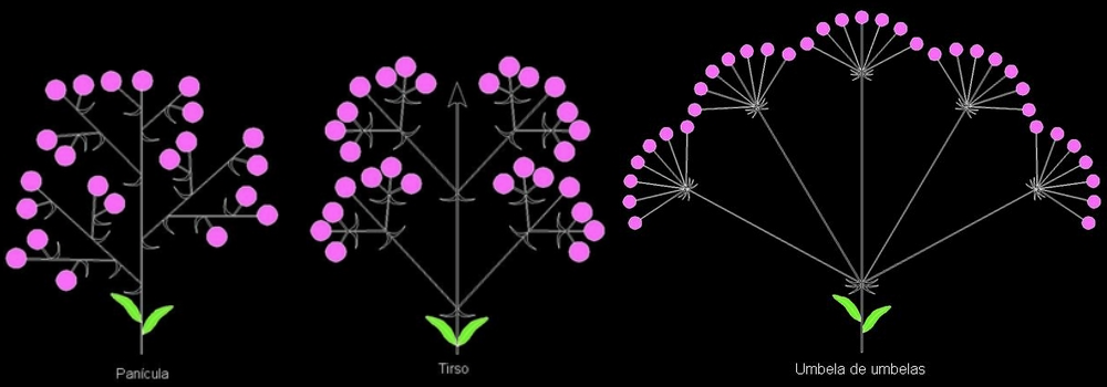 Agregados de inflorescencias unitarias (también llamadas “primarias” o “parciales”); cada inflorescencia unitaria es una subunidad de la inflorescencia secundaria que, en sí misma, se asemeja a un tipo de inflorescencia.