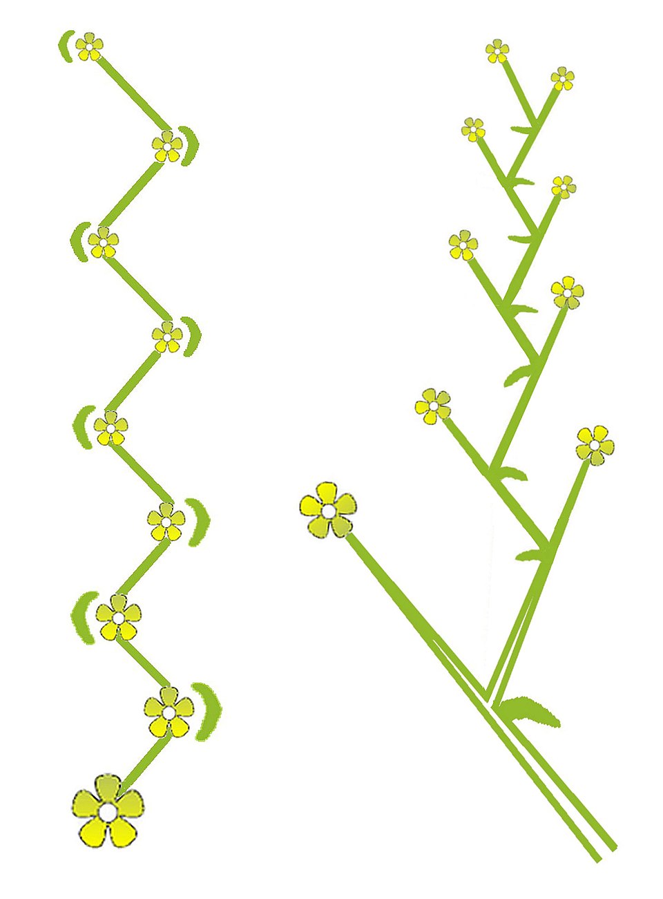 Se desarrolla sólo una flor por debajo de cada flor terminal, proceso que se repite consecutivamente: cima circinada o escorpioide (ramificación en la misma dirección), cima helicoidal o helicoide (ramificación en dirección opuesta)