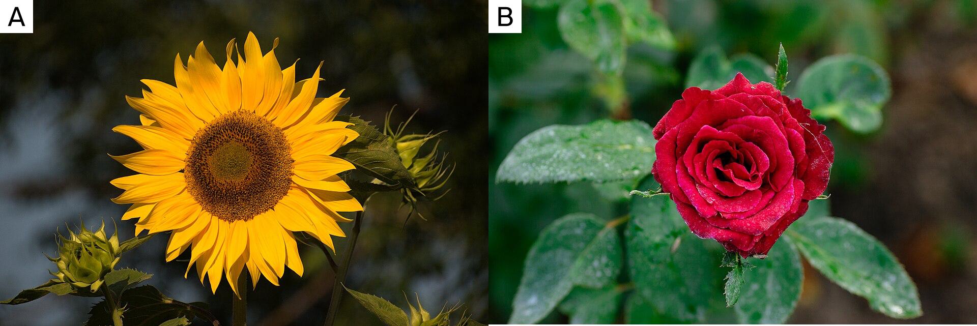 Fig 1: Las «flores» más populares. A. El girasol (Helianthus annuus, Asteraceae). B. La Rosa (Rosa spp., Rosaceae).
