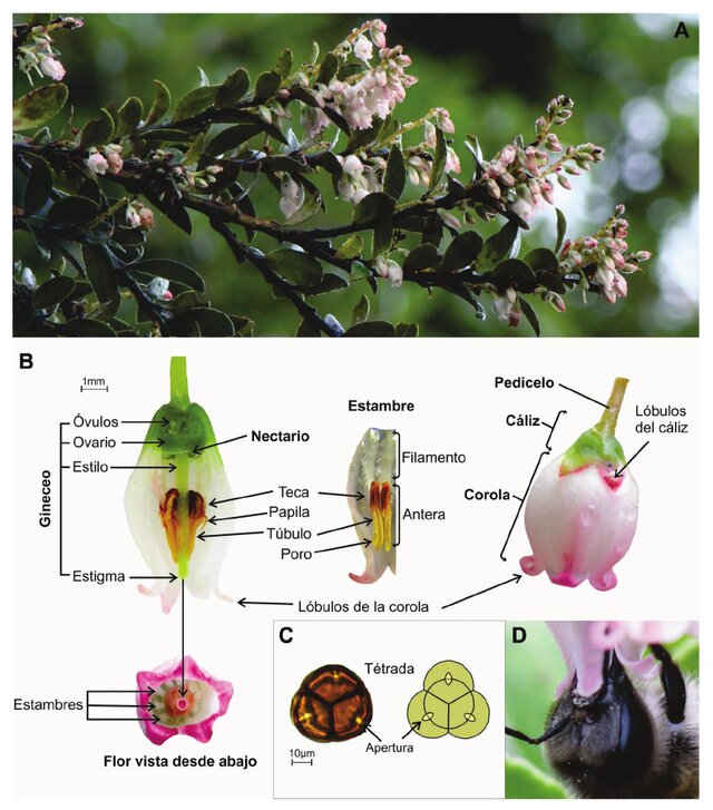 Fig 10: Mortiño (Vaccinium meridionale, Ericaceae). A. Inflorescencia. B. morfología de la flor. C. Grano de polen. D. Polen sobre la cabeza de Apis mellifera. Chamorro & Nates-Parra (2015).