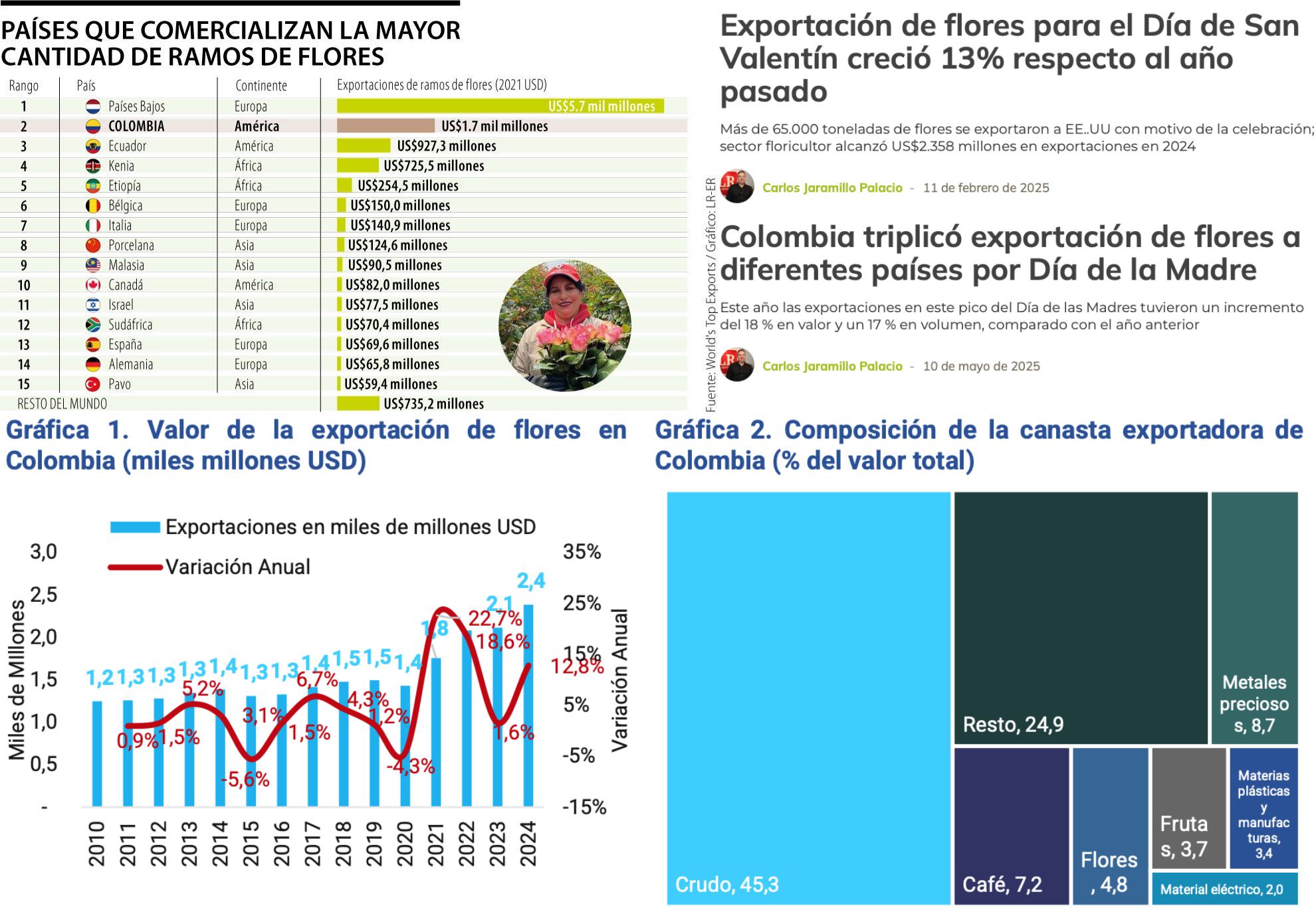 Fig 7: Colombia es el segundo exportado de flores a nivel mundial. Cuenta con más 60 especies de flores y más de 1.300 variedades. Agronegocios (2023, 2025a, 2025b), Córdoba & Osorio Quintero (2025).