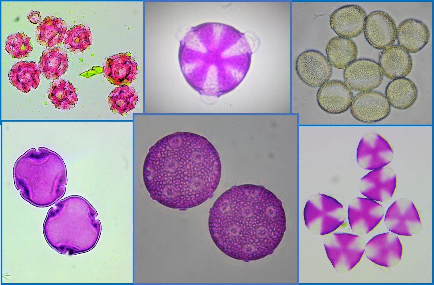 Fig 30: Granos de polen. Taraxacum sp. (Asteraceae), Lythrum salicaria (Lythraceae), Brassica napus (Brassicaceae), Tilia × europaea (Malvaceae), Silene dioica (Caryophyllaceae), Crataegus monogyna (Rosaceae). Jobson (2020).