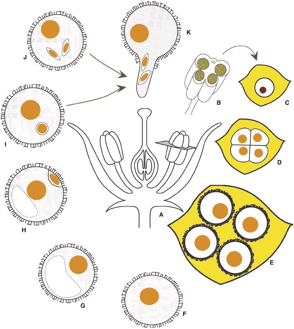 Células de forma y dimensión variables, dotadas de una cubierta muy resistente o esporodermis, que se forman dentro de los sacos polínicos del estambre y tiene como misión, una vez formado el microgametófito pluricelular, fecundar el óvulo. Saenz-Laín (2004).