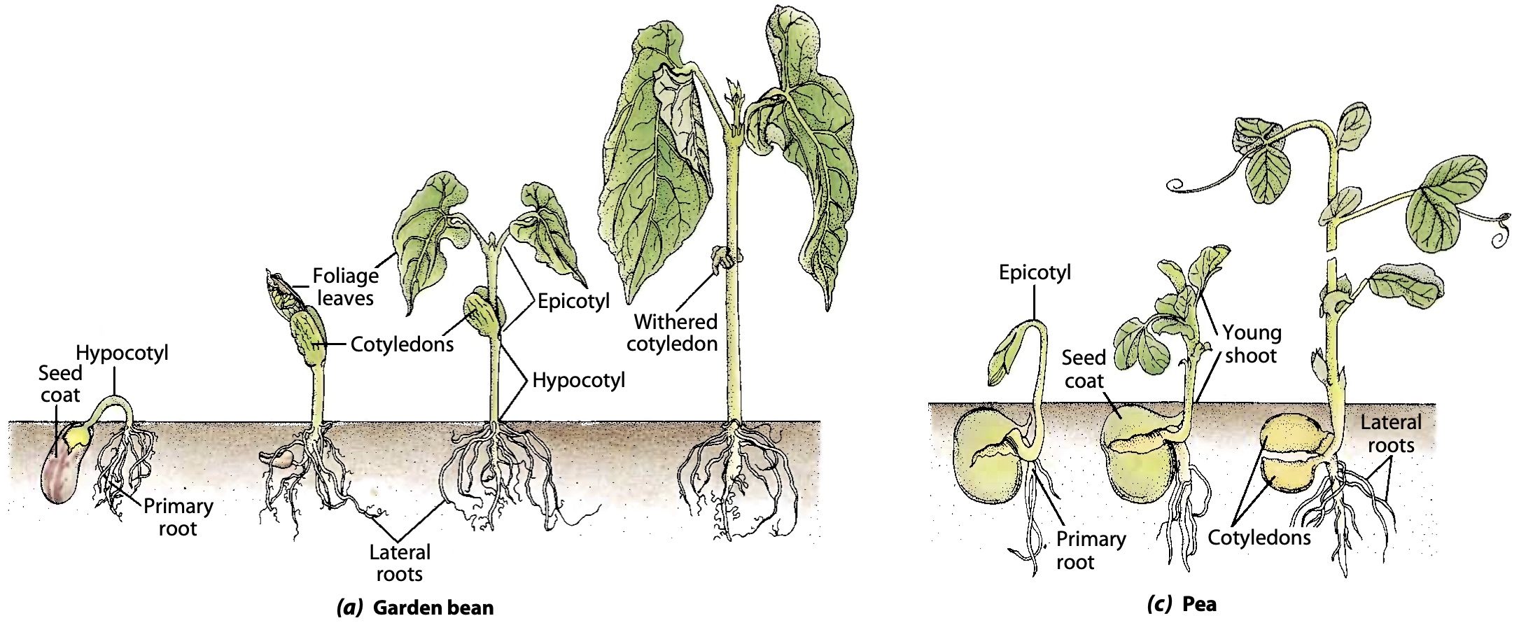 Fig 77: Germinación. A. Epígea en frijol (Phaseolus vulgaris, Fabaceae). B. Hipógea en arveja (Pisum sativum, Fabaceae). Evert & Eichhorn (2013).