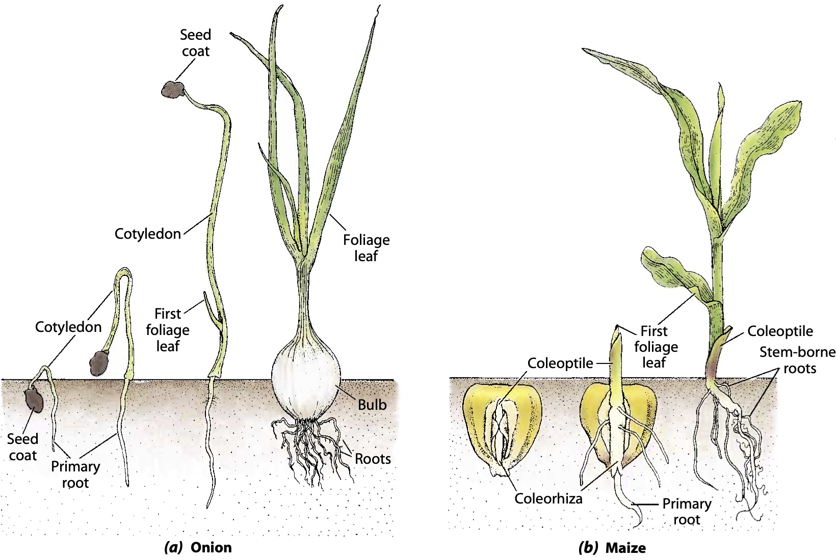 Fig 78: Germinación. A. Epígea en cebolla (Allium cepa, Amaryllidaceae). B. Hipógea en maíz (Zea mays, Poaceae). Evert & Eichhorn (2013).