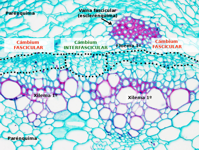 Meristemo lateral que forma los tejidos vasculares secundarios, floema secundario y xilema secundario, en el tallo y la raíz. Evert (2006).