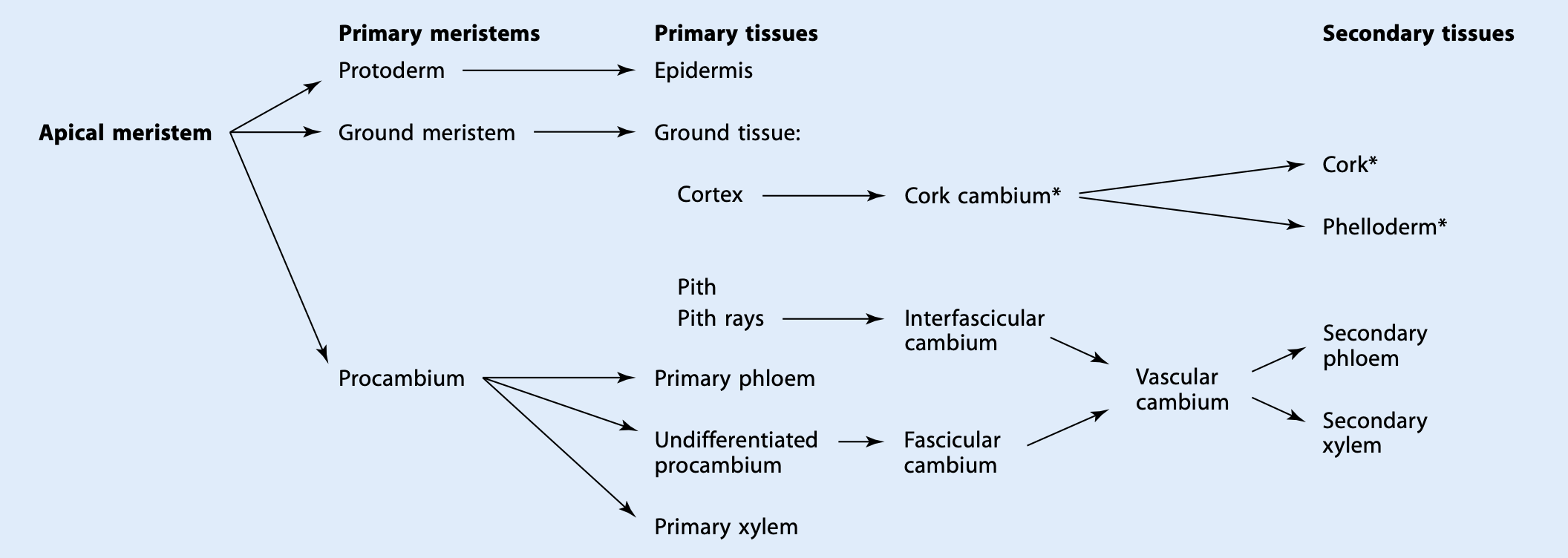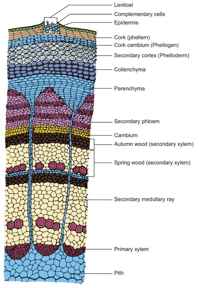 Meristemas que dan lugar a tejido secundario; el cambium vascular y el cambium de corcho (felogéno). Evert & Eichhorn (2013).