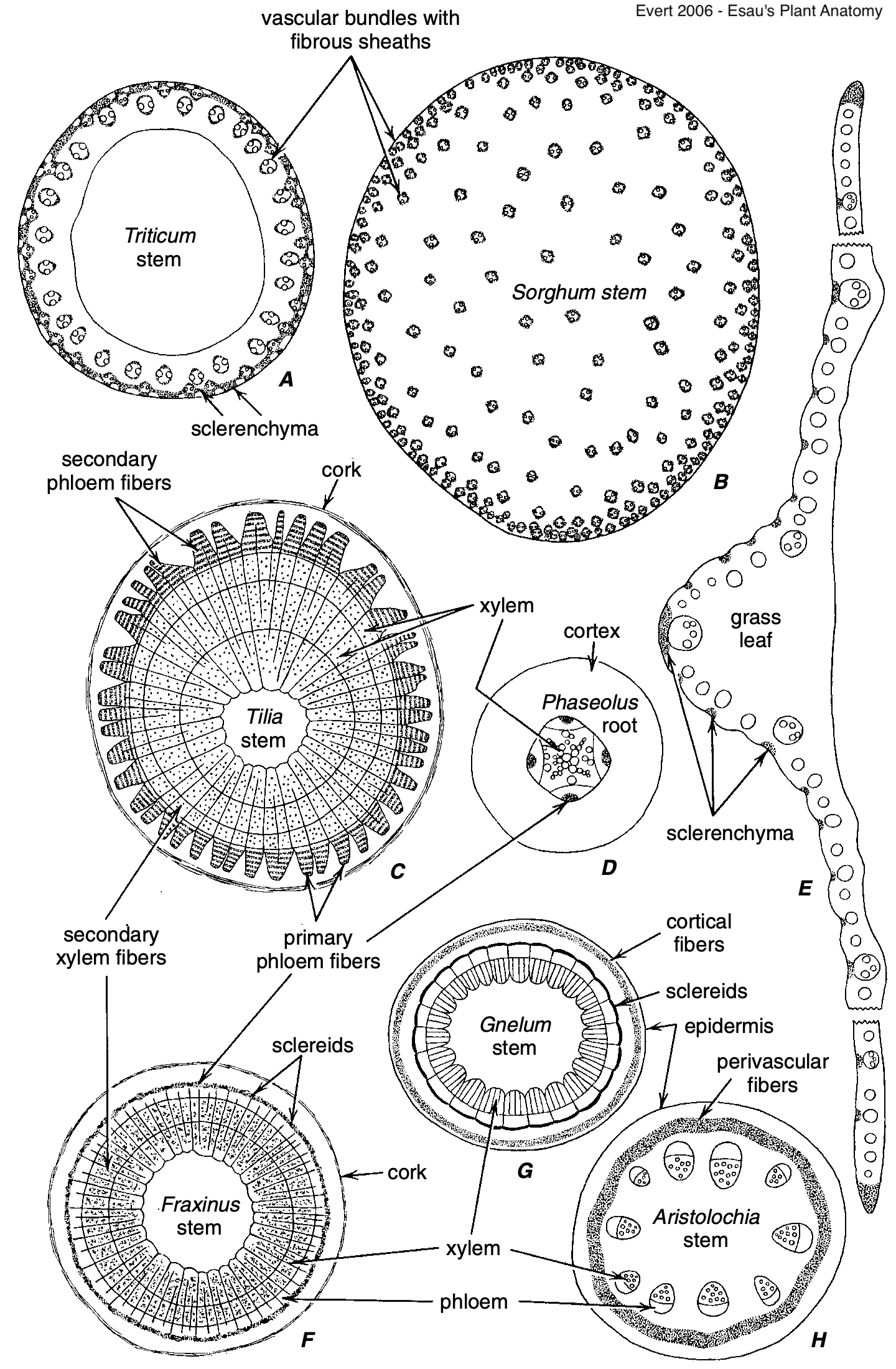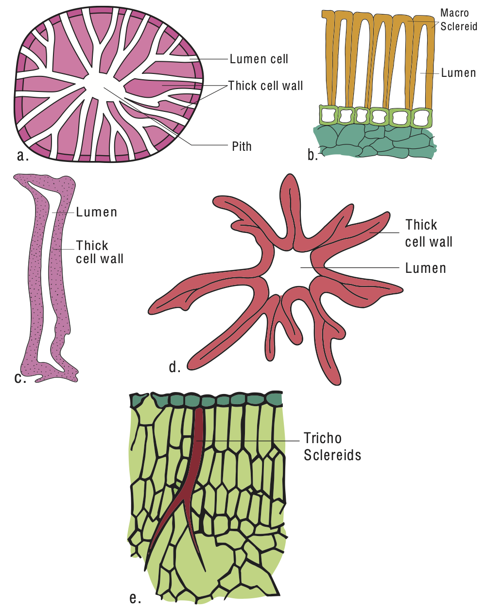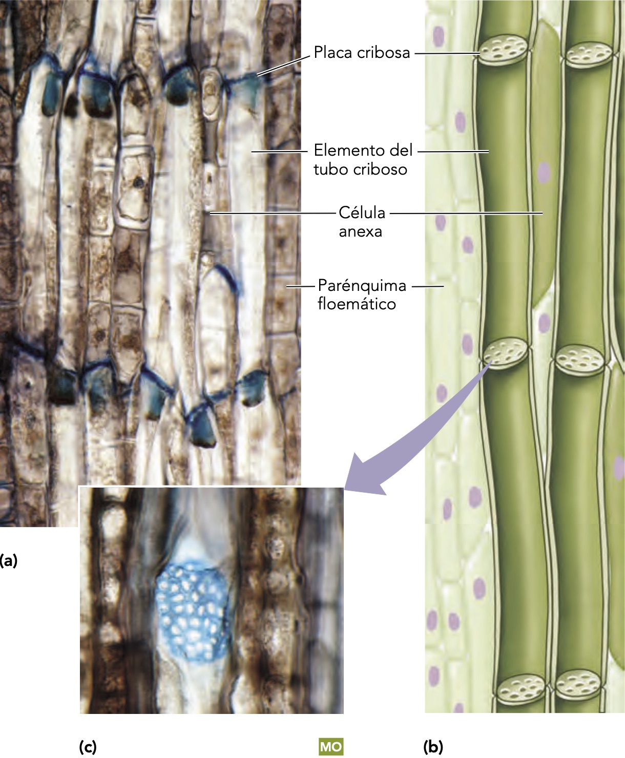 Fig 51: A. Braquiesclereidas en Pyrus communis. B. Astroesclereidas en Nymphaea odorata. C. Macroesclereidas en Phaseolus vulgaris, recuadro: macroesclereidas (M) y osteoesclereidas (O) aisladas de una Vicia faba. Crang et al. (2018).