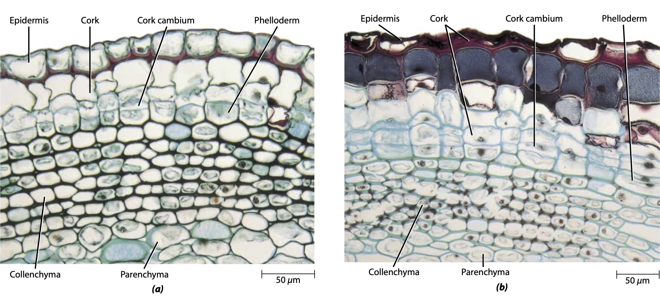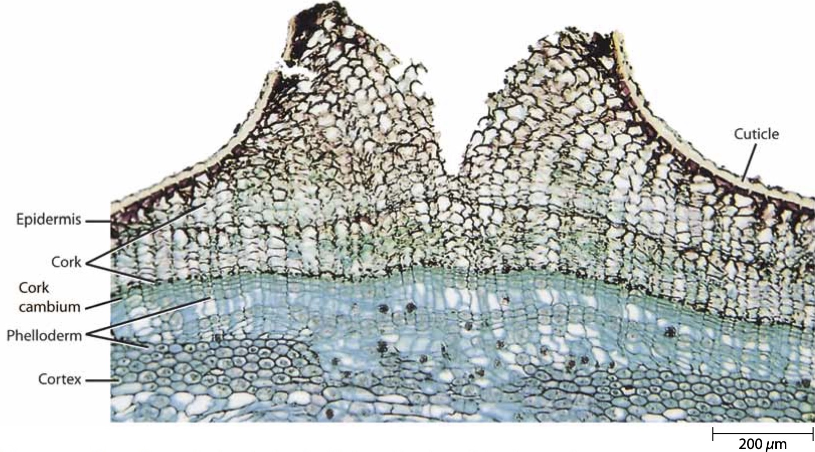 Meristema lateral que forma la peridermis, un tejido protector secundario común en tallos y raíces de plantas con semilla. Produce súber o corcho hacia el exterior y felodermis hacia el interior. Evert (2006).