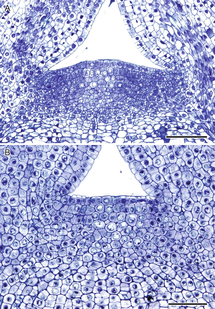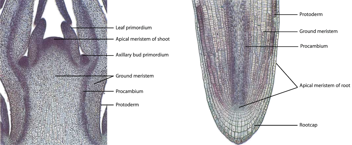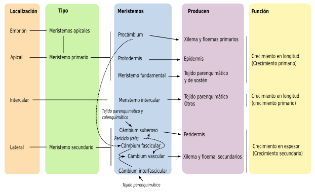 Regiones de tejido embrionario capaces de añadir células indefinidamente al cuerpo de la planta. Evert & Eichhorn (2013).