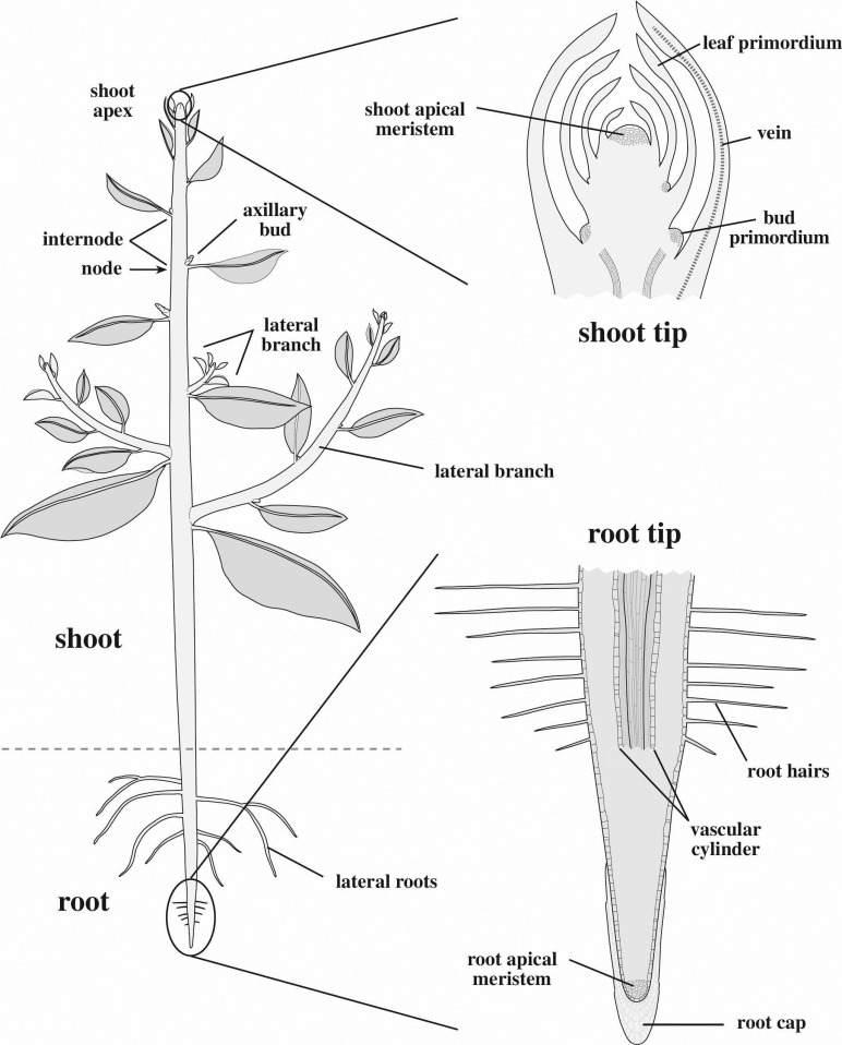 Fig 13: Meristemo apical caulinar y radical. Evert & Eichhorn (2013).