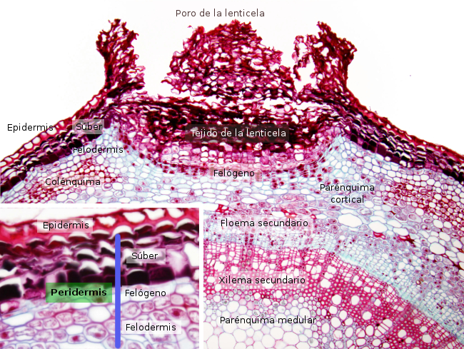 Tejido protector secundario que sustituye a la epidermis en tallos y raíces, raramente en otros órganos.