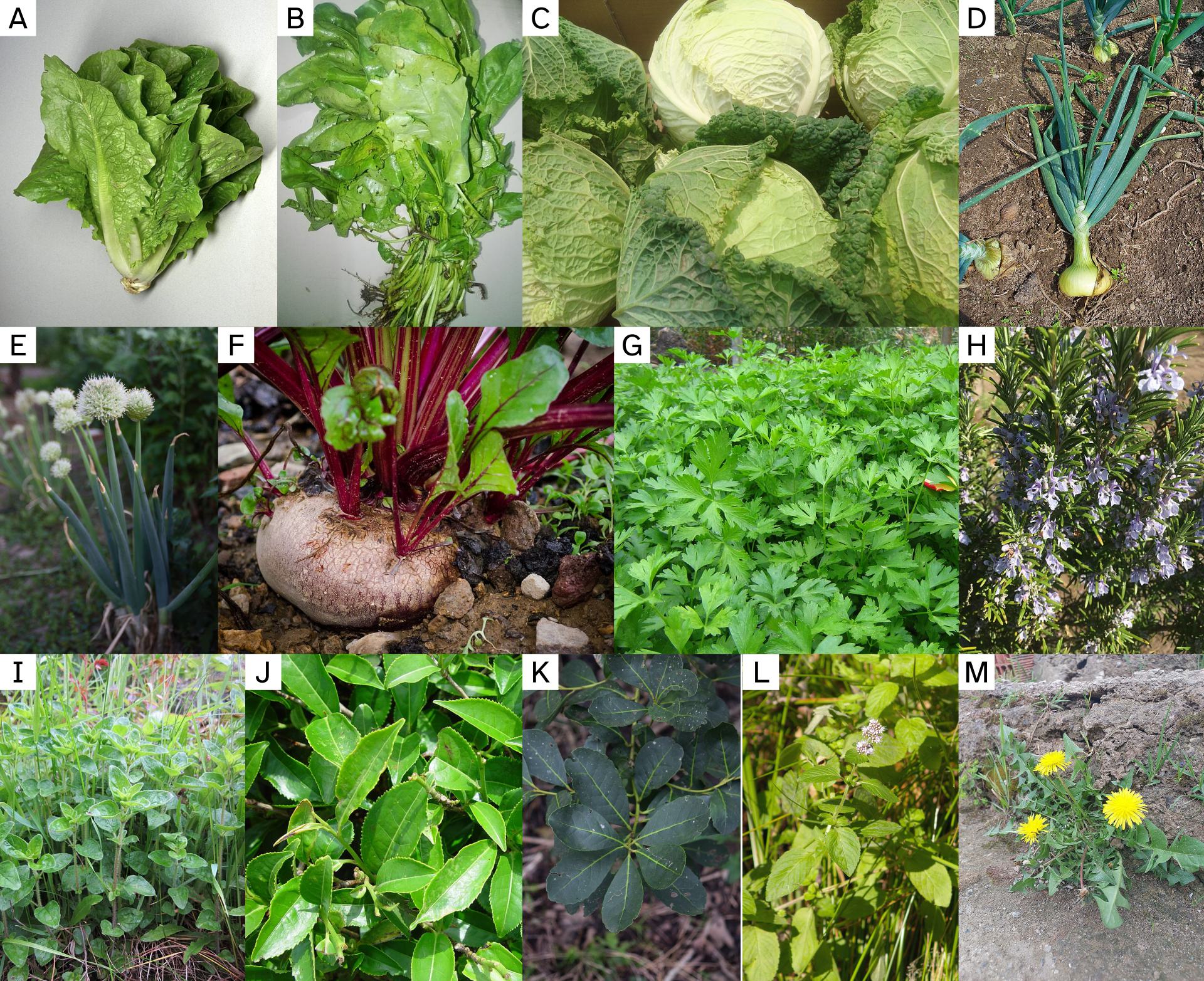 Fig 30: A. Lactuca sativa (lechuga). B Spinacia oleracea (espinaca). C. Brassica oleracea (repollo). D. Allium cepa (cebolla). E. Allium fistulosum (cebolla larga). F. Beta vulgaris (remolacha). G. Petroselinum crispum (perejil). H. Salvia rosmarinus (romero). I. Origanum vulgare (orégano). J. Camellia sinensis (té). K. Ilex paraguariensis (yerba mate). L. Mentha aquatica. M. Taraxacum officinale (diente de león).