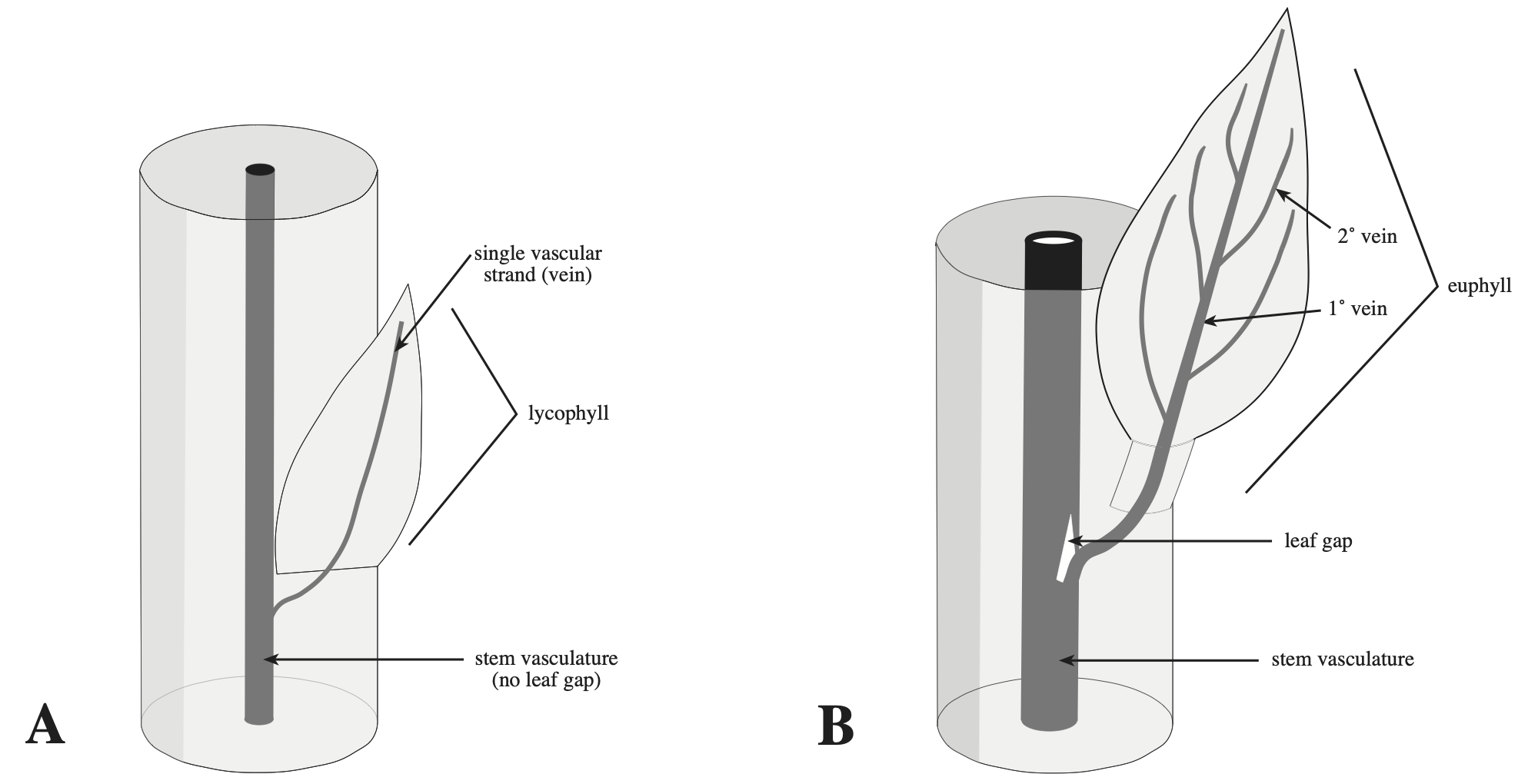 Fig 6: Hojas según su origen. A. Microfilo. B. Megafilo. Simpson (2019).