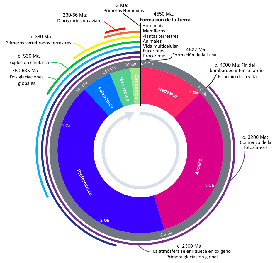 Los orígenes de los seres vivos están indicados por los depósitos más antiguos conocidos de grafito y estromatolitos. Los grandes yacimientos de minerales de hierro en bandas (oxidados) indican la presencia de oxígeno libre (y, por tanto, la evolución de la fotosíntesis). La aparición de las algas rojas es una prueba de la evolución de los organismos eucariotas pluricelulares, y los restos fósiles de plantas terrestres indican que estos organismos desarrollaron características que permitían su crecimiento en el aire. Niklas (2016).