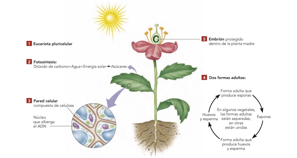 | Reproducción | Fundamentalmente asexual | Sexual y asexual; algunas especies presentan dos formas o fases adultas: una que produce esporas y otra que produce ovocélulas y espermatozoides | Sexual y asexual; dos formas o generaciones adultas: una que produce esporas y que produce ovocélulas y espermatozoides; embrión protegido dentro de la planta madre | Sexual y asexual | Fundamentalmente asexual; embrión protegido dentro de la madre en algunas especies, incluidos la mayoría de los mamíferos |