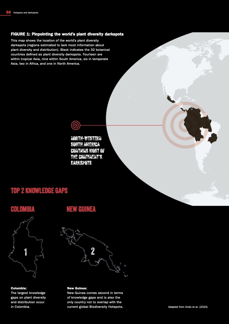 Fig 43: SiB Colombia (2025) reporta 13,581 especies de Embryophyta para Colombia. Angiospermas (11,526), Helechos (1,036), Musgos (580), Hepáticas (284), Gimnospermas (37), Antocerotas (3). Antioquia es el departamento con el mayor número de especies endémicas, así como de especies amenazadas.